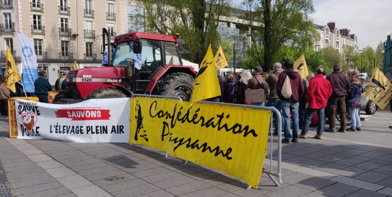 Photo : Le 13 avril, à Nantes, manifestation en soutien aux élevages de volaille en plein air. Les paysan·nes ont rappelé que « la densité des élevages est le plus fort facteur de risque de propagation de la grippe aviaire. Et qu'il faut trouver des solutions autres que la mise sous cloche des élevages plein air. »