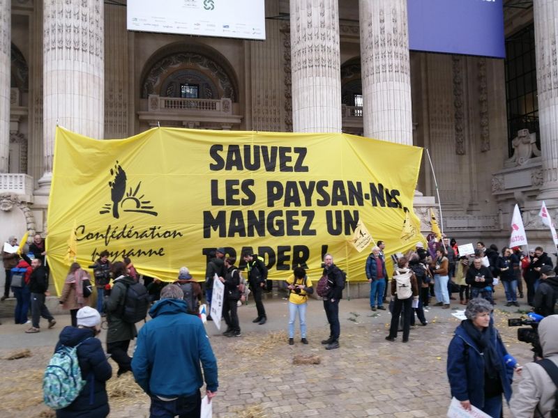 En déployant une immense banderole « Sauvez les paysan·nes, mangez un trader », nous recentrons le débat sur la spéculation sur les marchés mondiaux qui mettent en concurrence les paysan·nes du monde entier. C'est bien ce système économique injuste qu'il faut remettre en cause pour la rémunération des paysan·nes, pour que le rôle nourricier de l'agriculture soit reconnu à sa juste valeur, dans le respect de la souveraineté alimentaire des peuples.