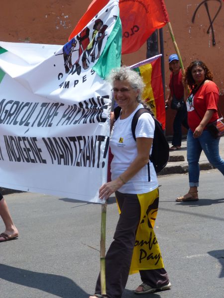 Le mercredi 10 décembre, c'est le jour de la marche pour la défense de la Terre Mère, la Pachamama des Amérindiens. Plus de 20 000 personnes se mobilisent dans les rues de Lima sous de multiples bannières. Une importante représentation de syndicats de travailleurs et d'organisations paysannes en début de marche prouve qu'ils sont le moteur du changement et la force la plus puissante pour renverser la tendance. Les organisations de femmes sont aussi très présentes et revendiquent haut et fort leur reconnaissance dans le processus de changement, car souvent pilier indispensable de la société, notamment dans les communautés rurales.