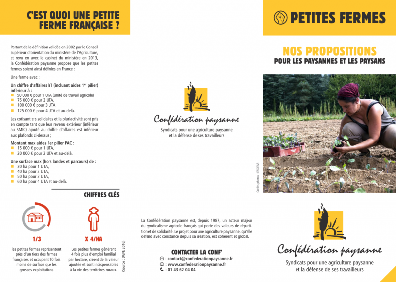 Pour avoir 1 million de paysan·nes, nous devons encourager les petites fermes (PF). Ceci suppose leur reconnaissance officielle et la mise en place d'aides spécifiques, de normes, d'une fiscalité et de soutiens adaptés à leur singularité.